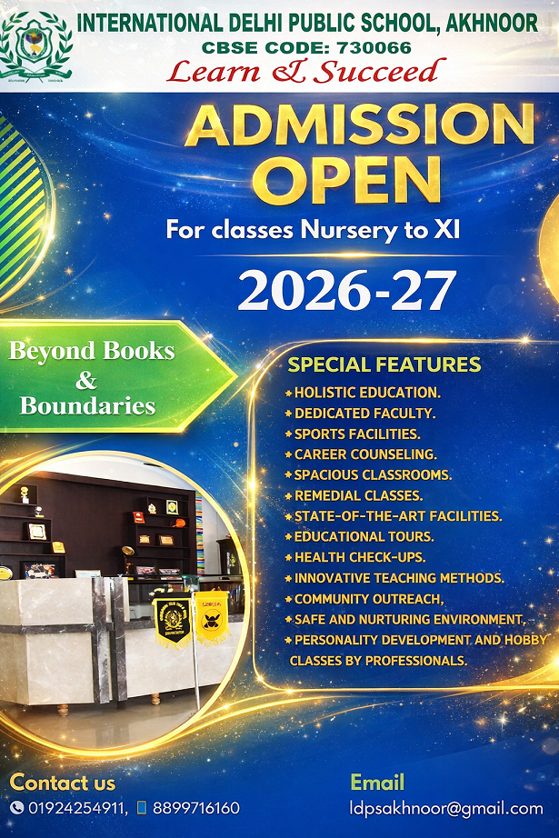 Creativity thrives in a tranquil milieu. International Delhi Public School, Akhnoor is bliss for the prospective citizens who have lent the soul in the form of this inimitable marvel of architecture where children can explore themselves and redefine their umpteen endowments. This home for children unfurl into spacious piece of land with lush green lawns, magnanimous shaded outdoors for contemplation, recreation and interaction. The spacious and well – lit rooms breathe in fresh air with an assortment of elegant furniture.