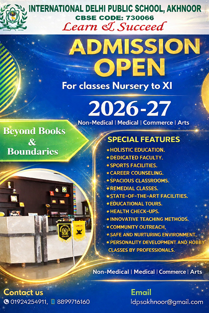 Creativity thrives in a tranquil milieu. International Delhi Public School, Akhnoor is bliss for the prospective citizens who have lent the soul in the form of this inimitable marvel of architecture where children can explore themselves and redefine their umpteen endowments. This home for children unfurl into spacious piece of land with lush green lawns, magnanimous shaded outdoors for contemplation, recreation and interaction. The spacious and well – lit rooms breathe in fresh air with an assortment of elegant furniture.